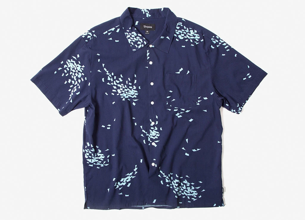 The Brixton Lovitz shirt is cotton/rayon poplin resort shirt. An allover print pattern is the focus and its finished with custom woven branded details. It has a single chest pocket and a straight cut hem.