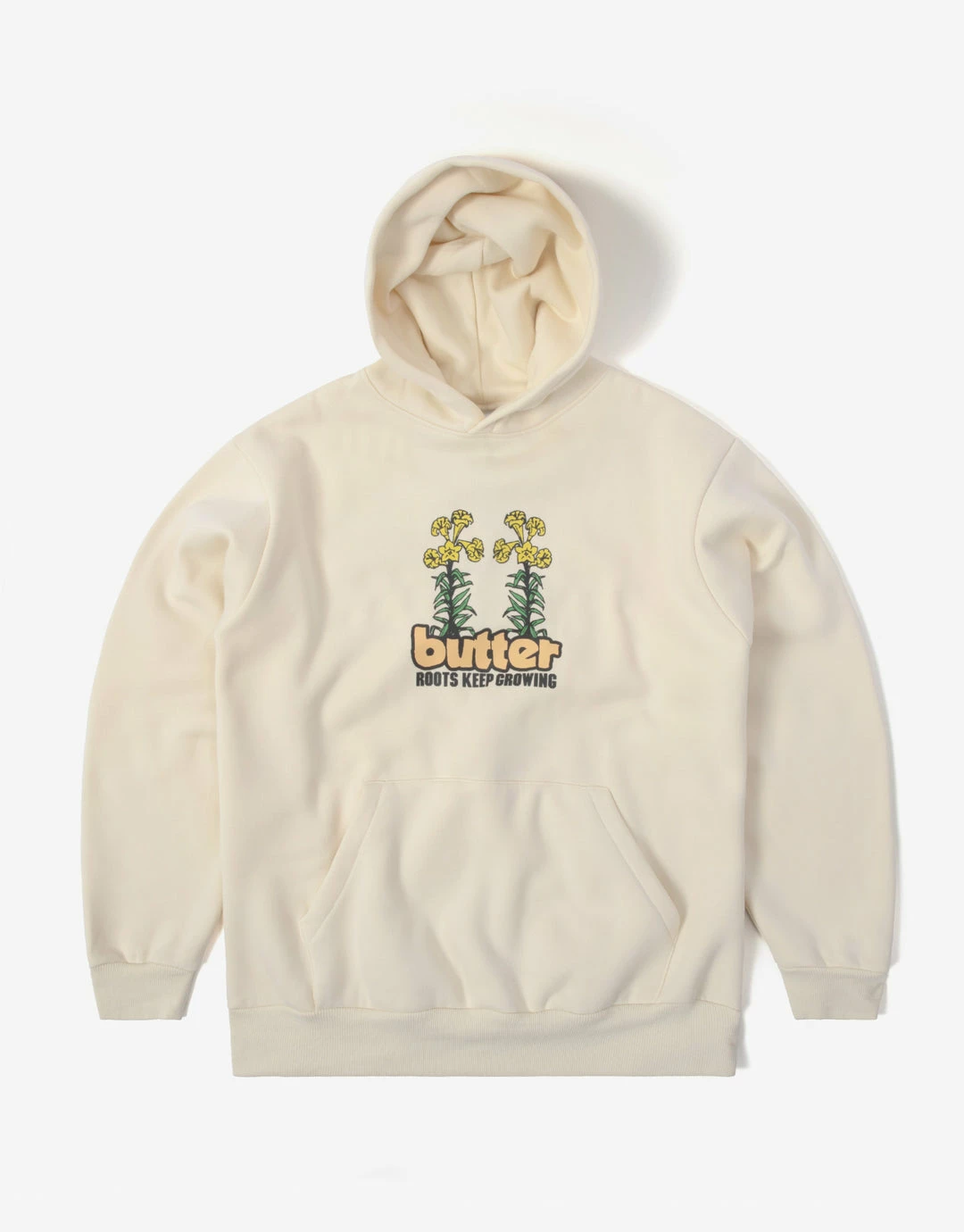 Butter Goods’ Roots Hoody is a pullover style piece made from a heavyweight, 100% cotton. It features a seasonal graphic and classic Butter logo printed to the chest, along with drawstring hood, kangaroo pouch and ribbed trims.