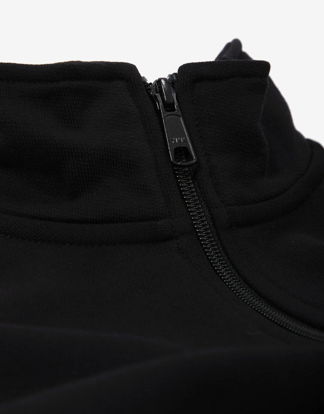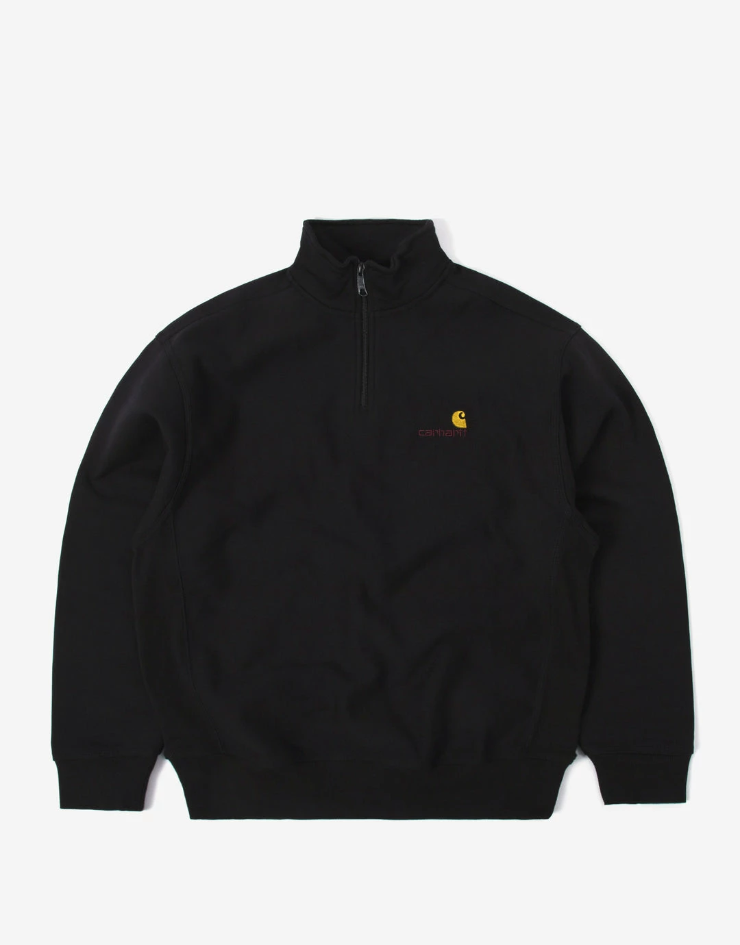 The Half Zip American Script Sweatshirt is constructed from a 12.3 oz cotton-polyester blend and brushed for extra softness and warmth, without losing breathability. The garment features a high neck with a zipper and a small logo. Appears in a loose, boxy silhouette.