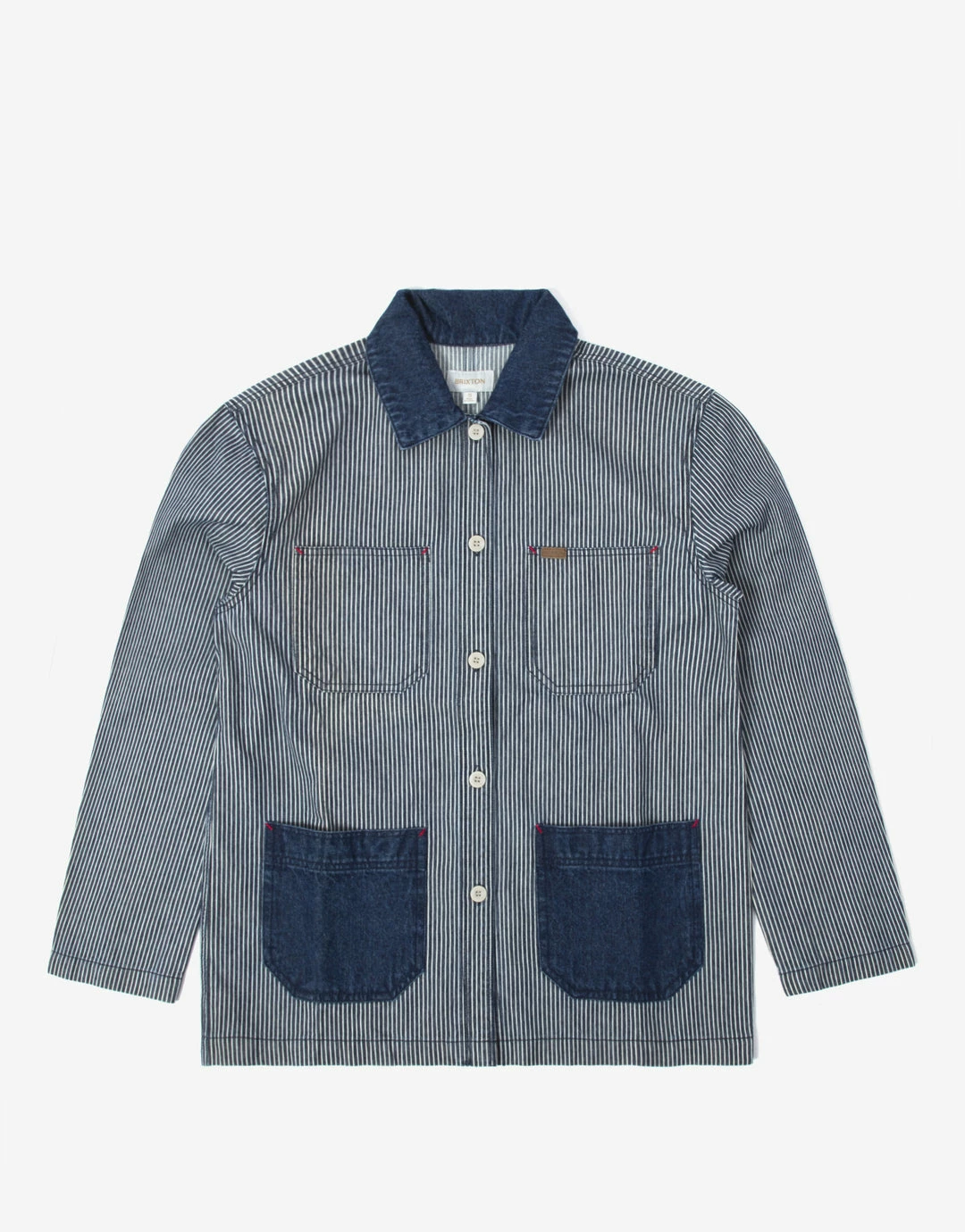 Yarn dyed railroad stripe 100% cotton indigo denim make up the Survey Chore Coat that will be your go-to on those spring days. Four patch pockets for style and function.