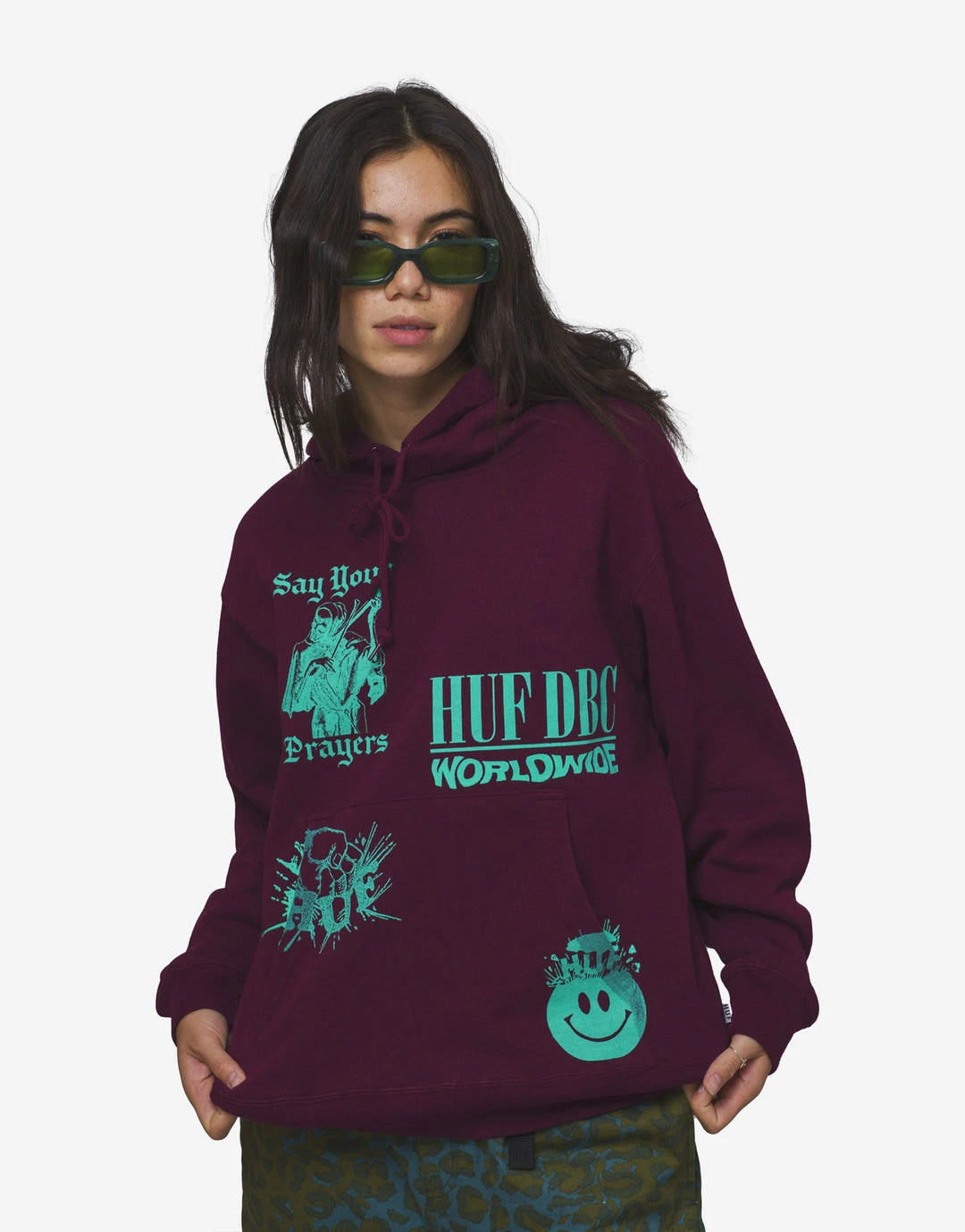 The Disorder Pullover Hoodie is made of super-soft fleece for maximum warmth and comfort through chilly weather. Heritage graphics from the HUF archive are featured in a scatter-placement print at the front, while a bold typographic-play logo spans the back.