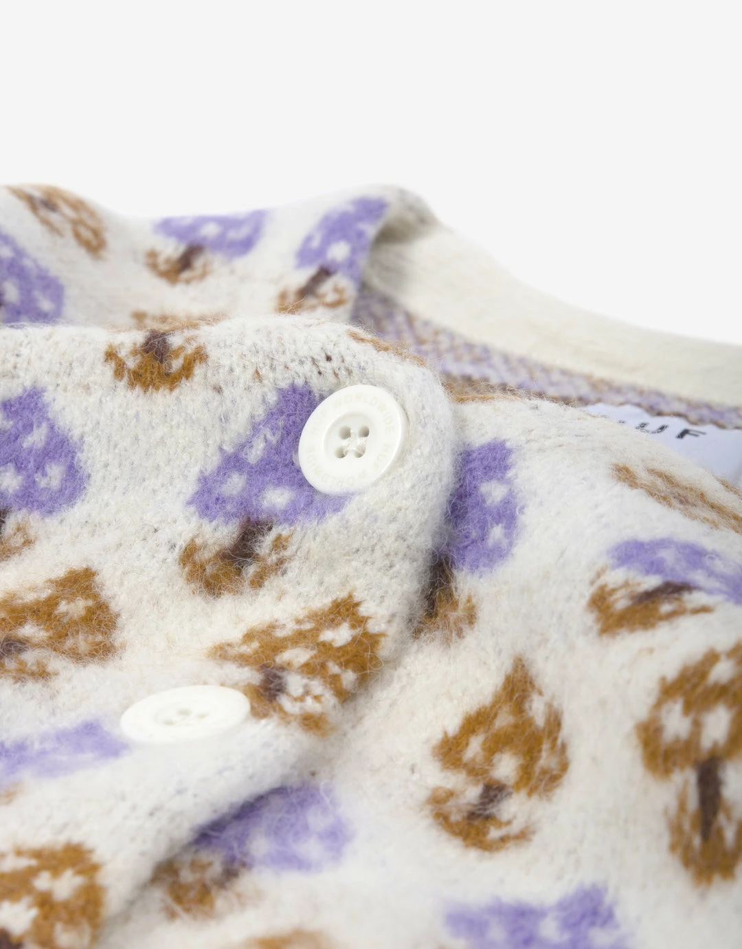 The Shroom Cropped Cardigan features all over jacquard multi coloured shroom artwork, and front button closure.