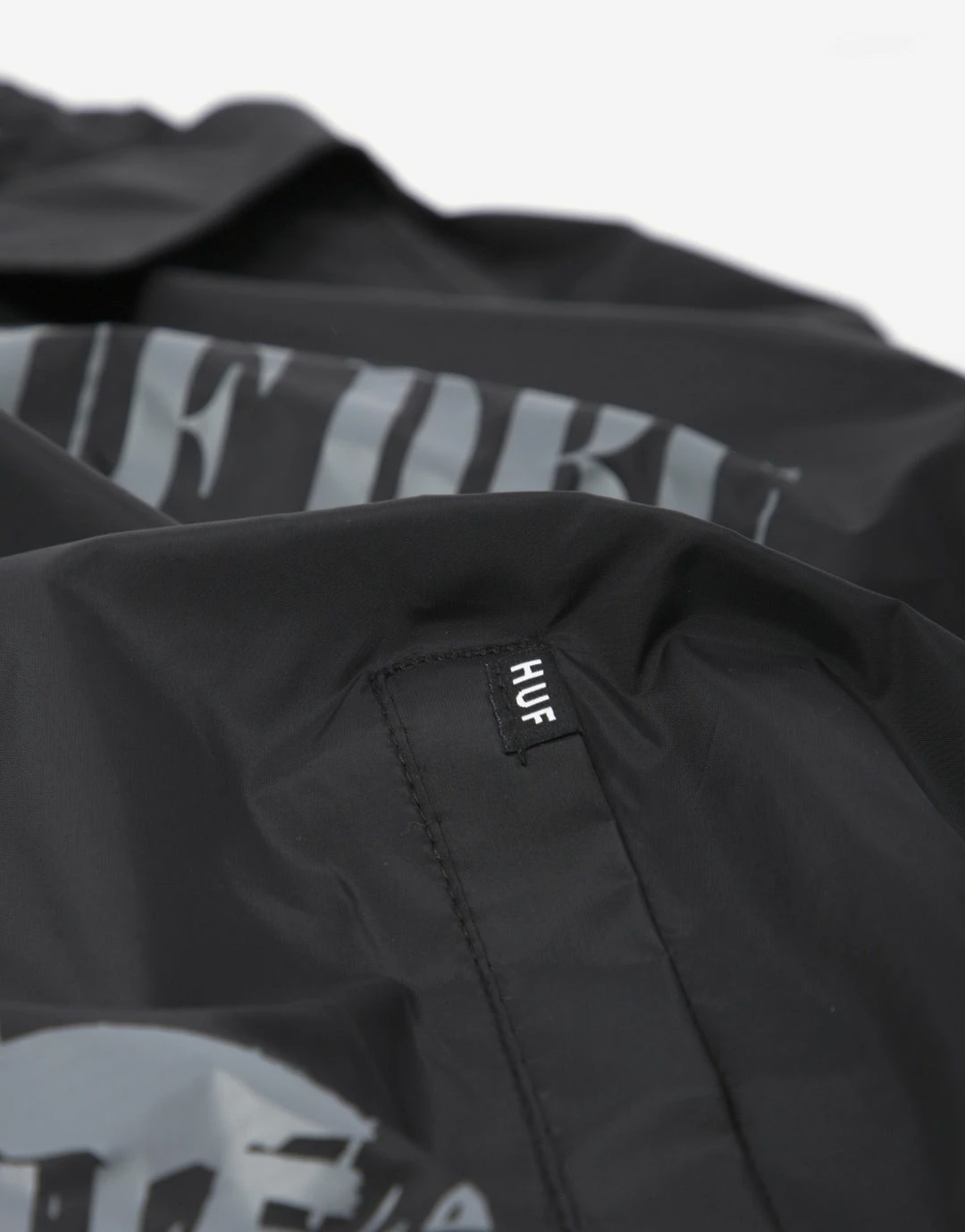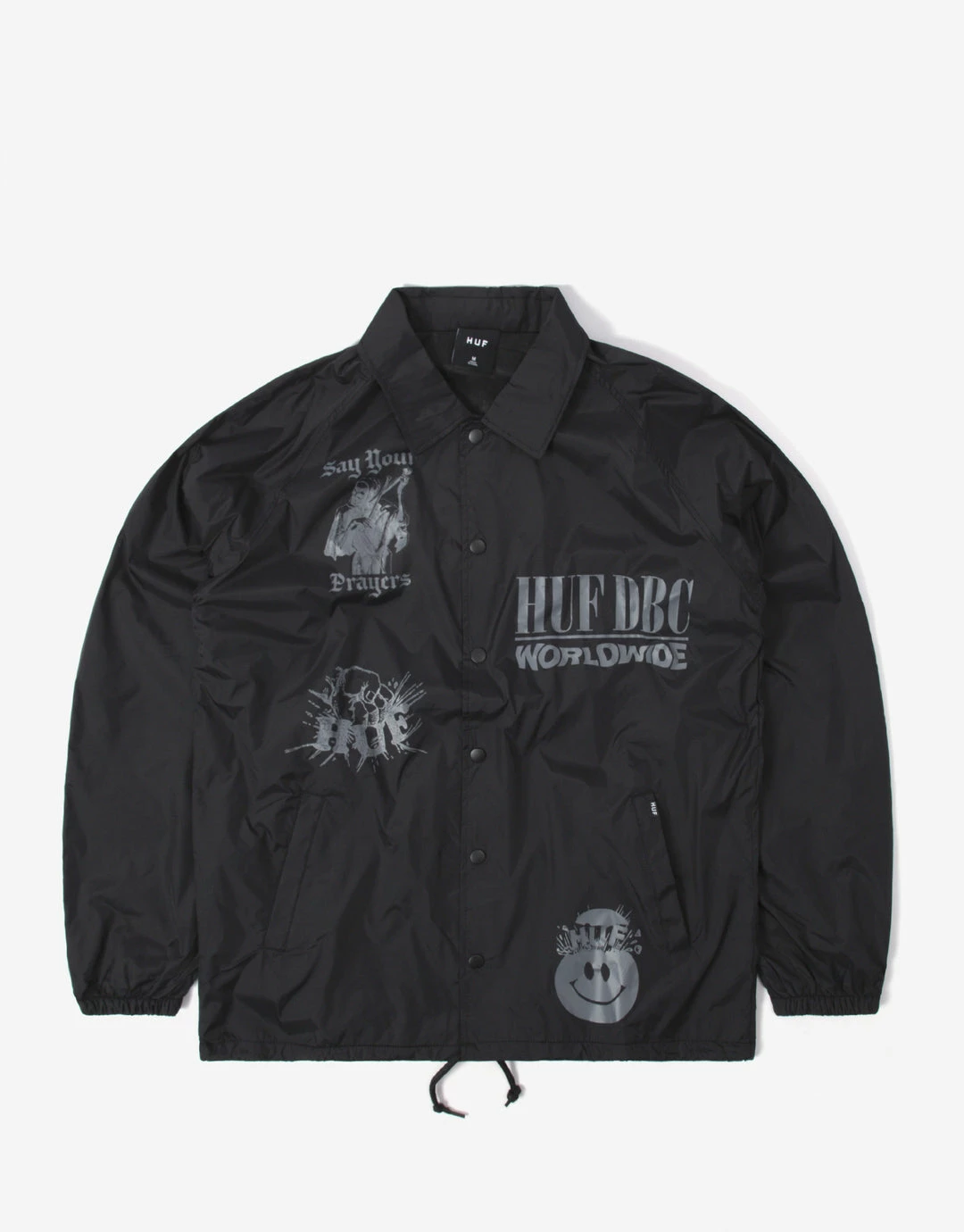HUF opt for a graphic heavy approach with the Disorder Coaches Jacket for Fall. In the traditional coaches jacket silhouette and Nylon material, the jacket is DWR coated for water resistant and features screen printed graphics on the front and back.Â