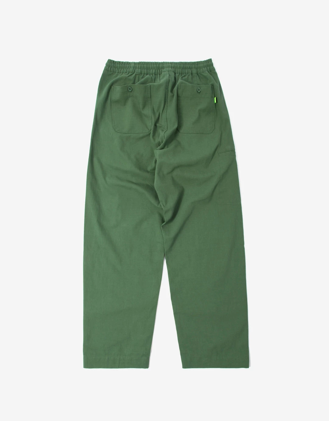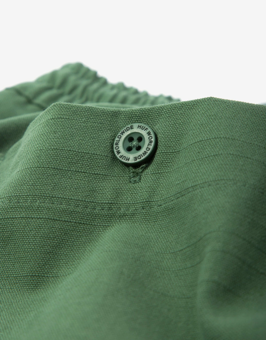 HUF’s Skate Leisure Pant from the new Spring collection are a baggy fit style pant inspired by 60s military garments. They are made from a cotton ripstop and come with an elasticated drawstring waistband, twin on seam side pockets, hidden stash pocket, twin rear pockets with button closure and Green Buddy artwork on the interior waistband.
