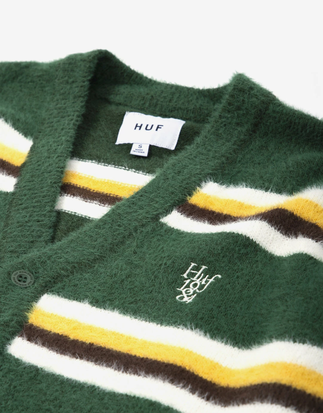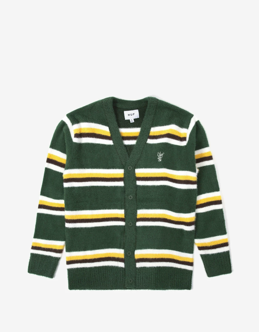 Made of super-soft faux mohair, the grunge-inspired 1984 Mohair Stripe Cardigan features all-over jacquard-knit multicoloured striping for a retro vibe. Cut with a buttoned front for easy layering, the cardigan is finished with rib-knit trims and an embroidered HUF logo at left chest.