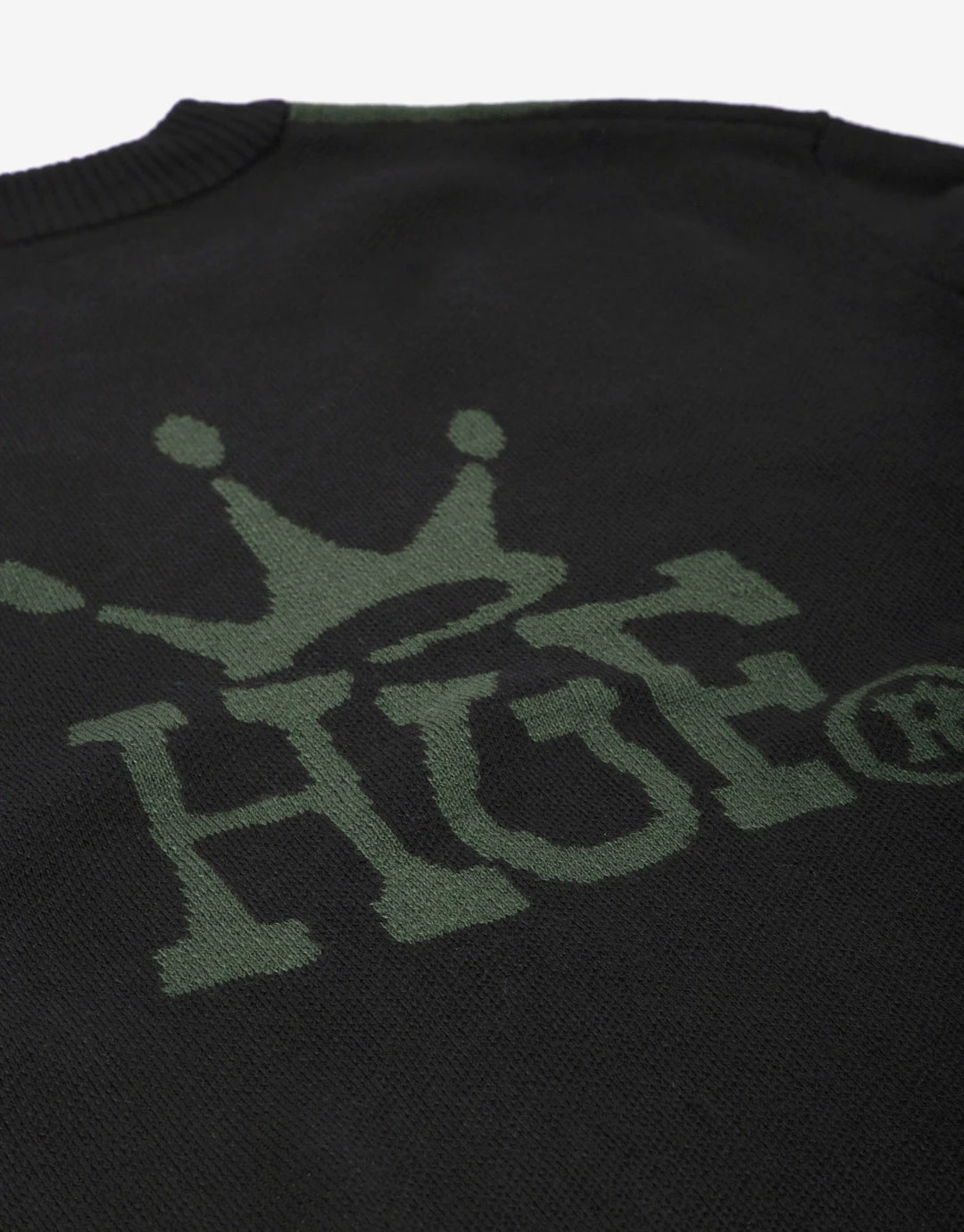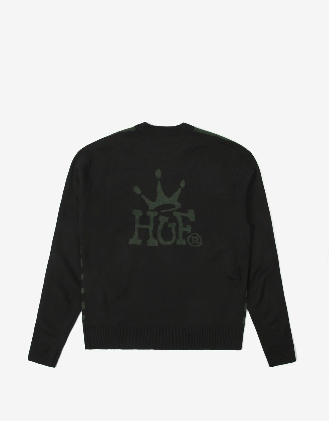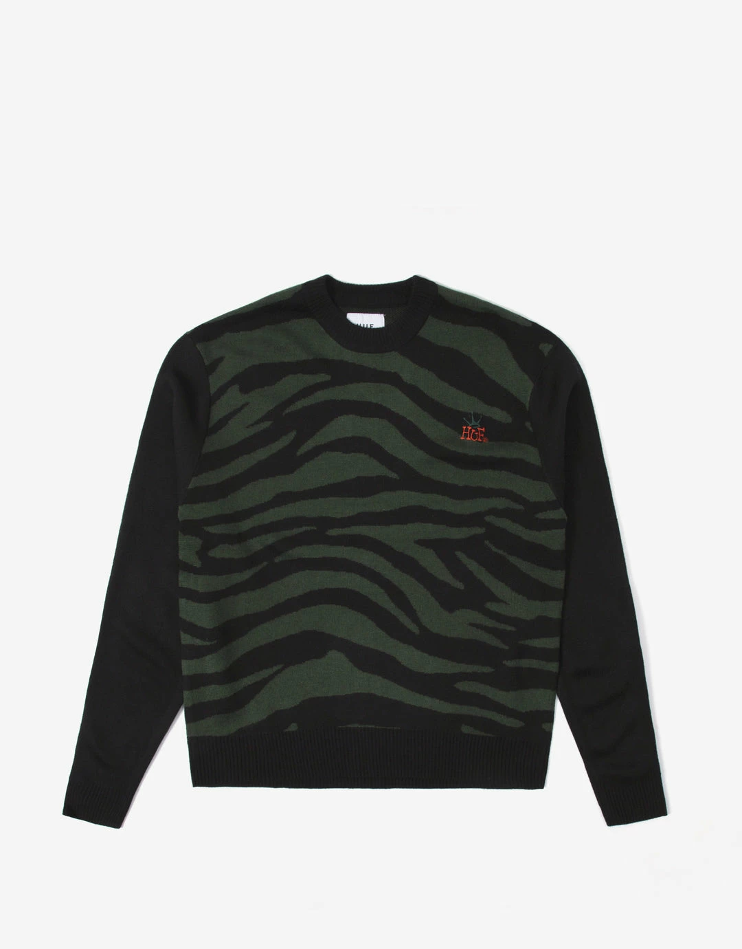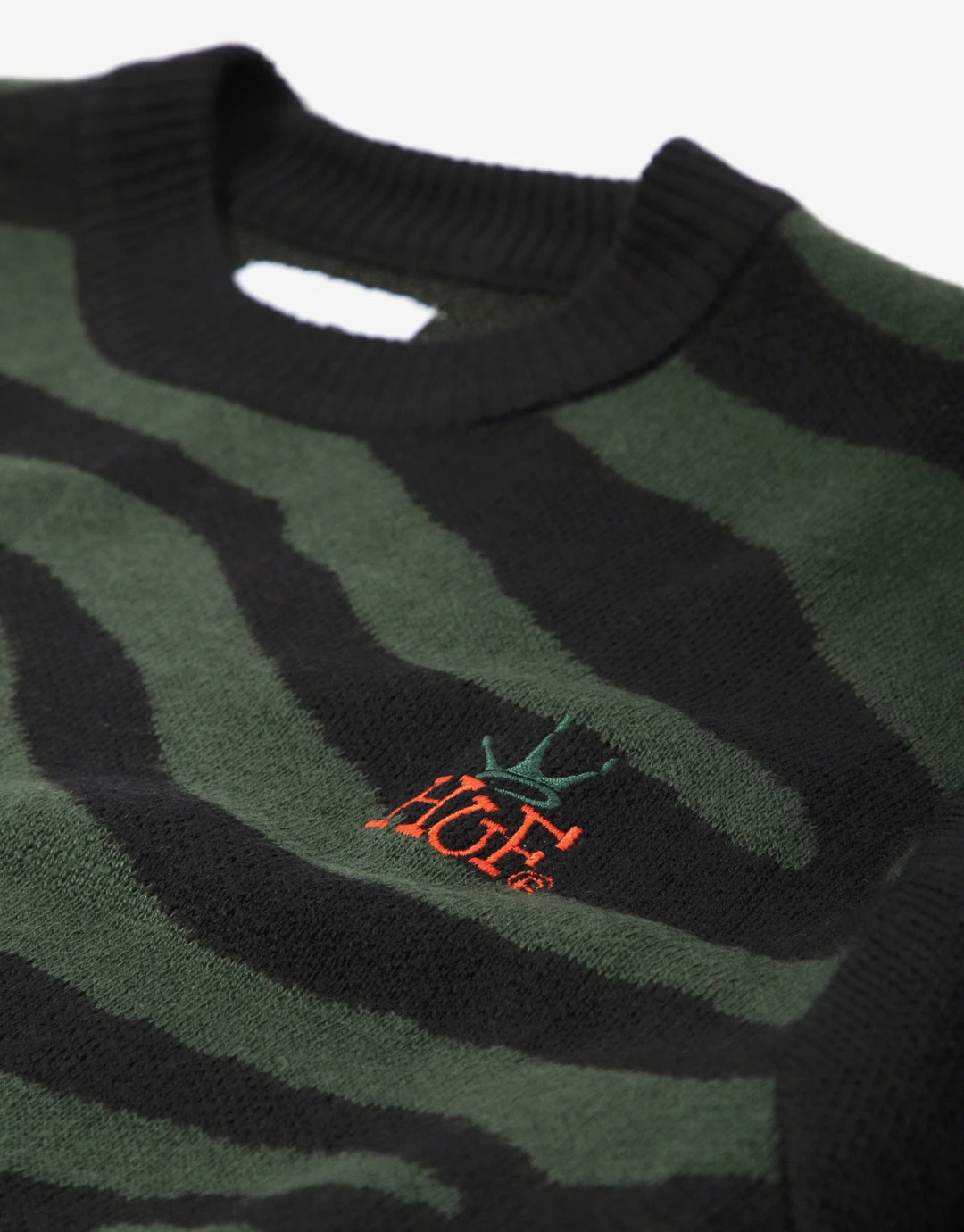 Knit from comfy 12-gauge acrylic in a relaxed-fit silhouette, the HUF Crown Sweater features a zebra-inspired all-over pattern in jacquard-knit at the front. A hand-lettered HUF logo topped with a crown at the left chest and back is a nod to classic streetwear iconography, while rib-knit trims finish this must-have look.