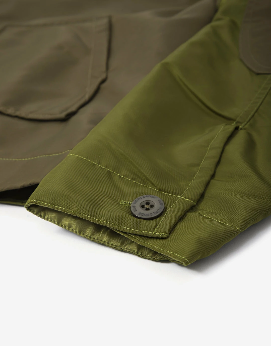 Inspired by military flight Jackets, this new classic features a two-tone nylon shell with contrast pop collar, front button closure and side pocket details.