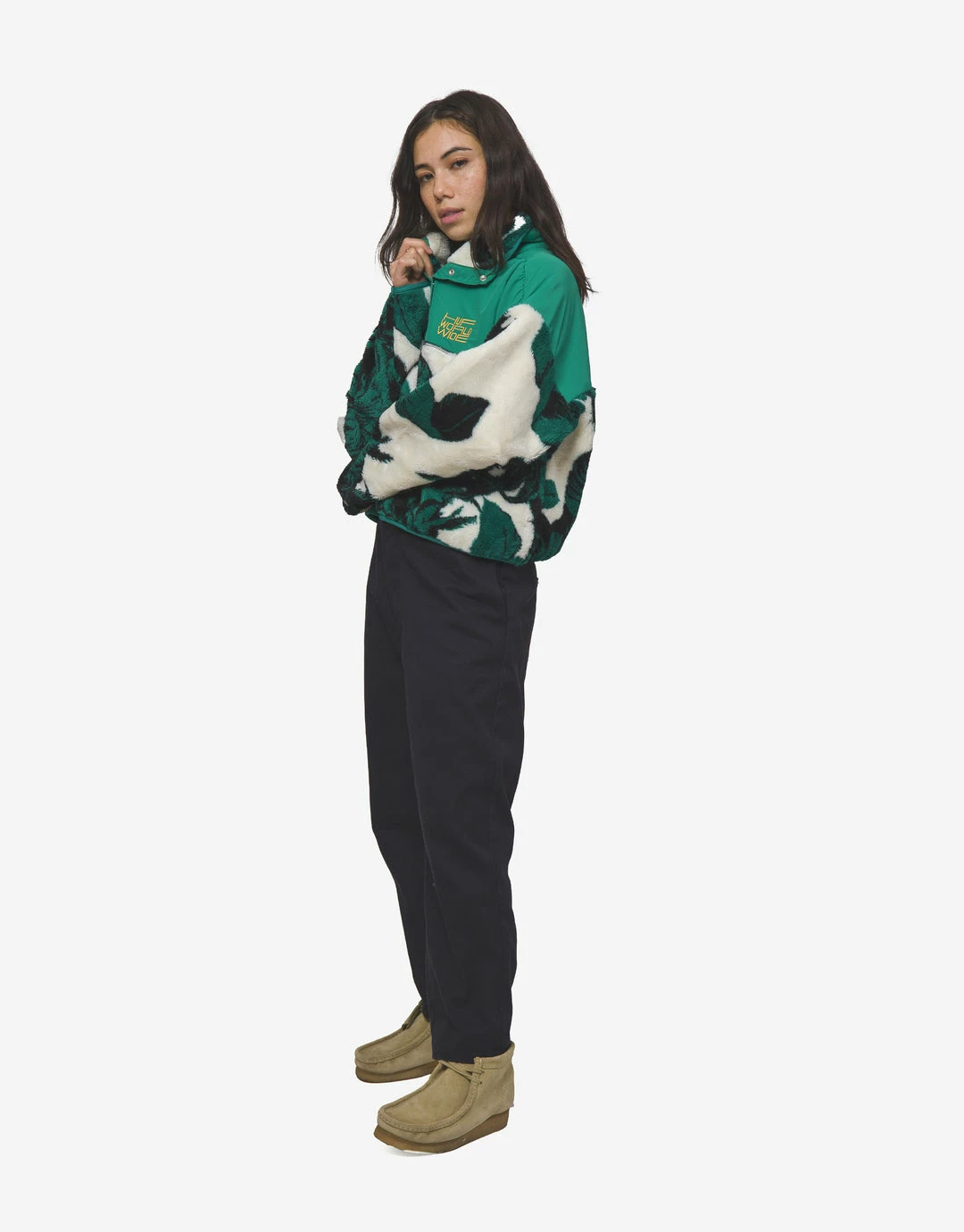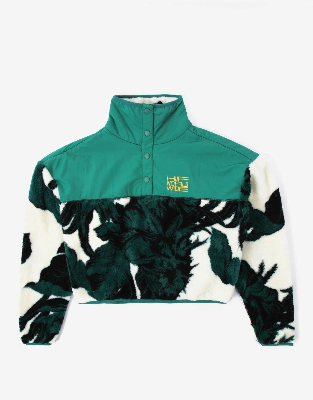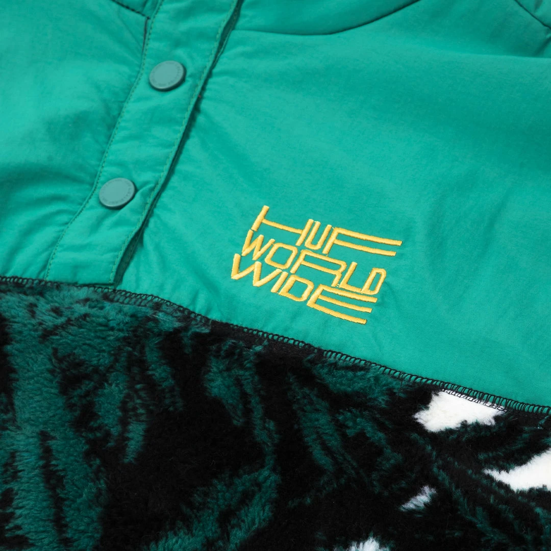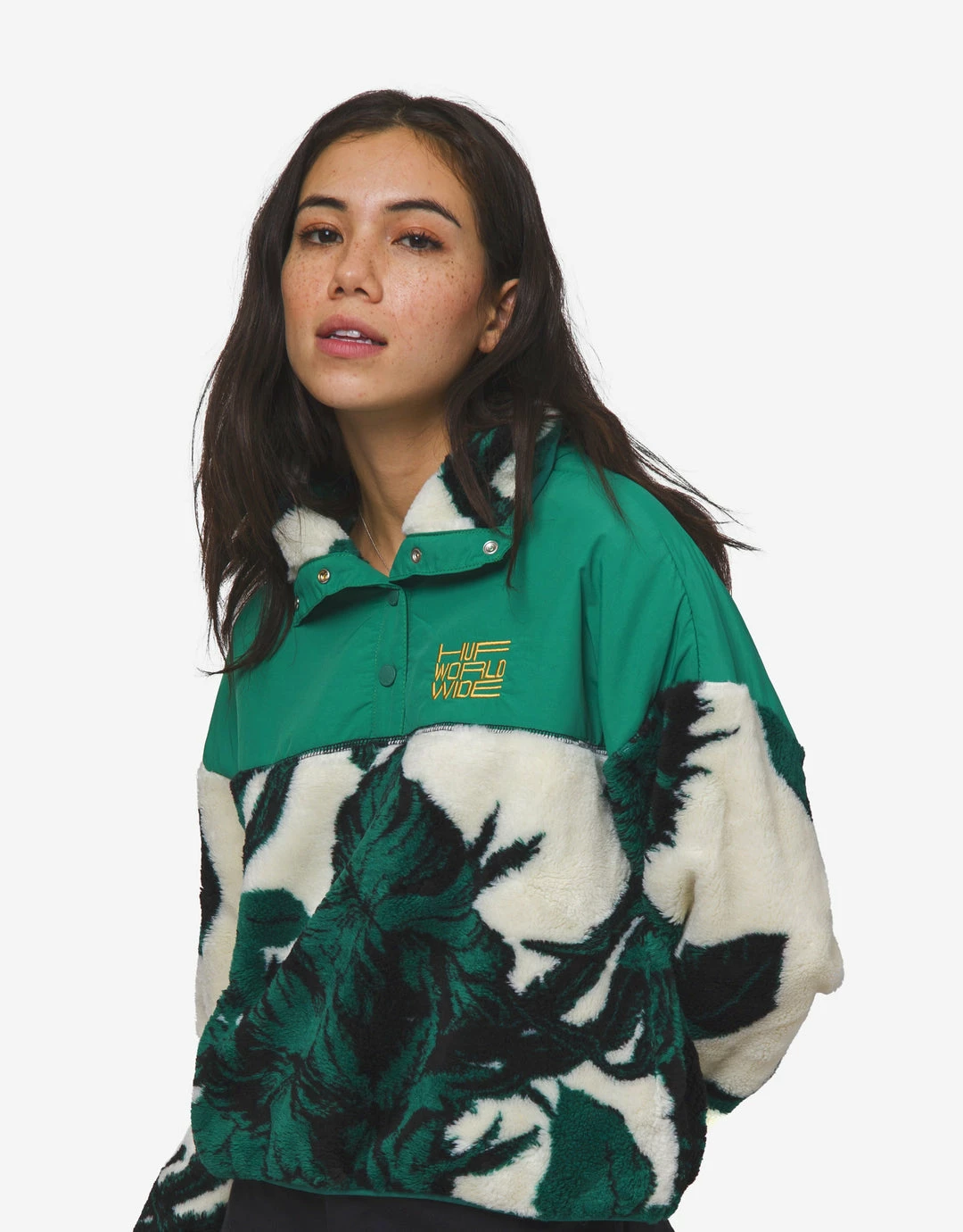 Inspired by vintage hiking gear, the classic-meets-cozy Sativa Sherpa Pullover is cut in a boxy cropped silhouette and features a seasonal sativa floral print over the soft Sherpa body. Topped with colour-blocked taslan nylon panels, this must-have pullover is complete with a quarter-snap placket, stand-up collar, and an embroidered HUF logo at left chest.