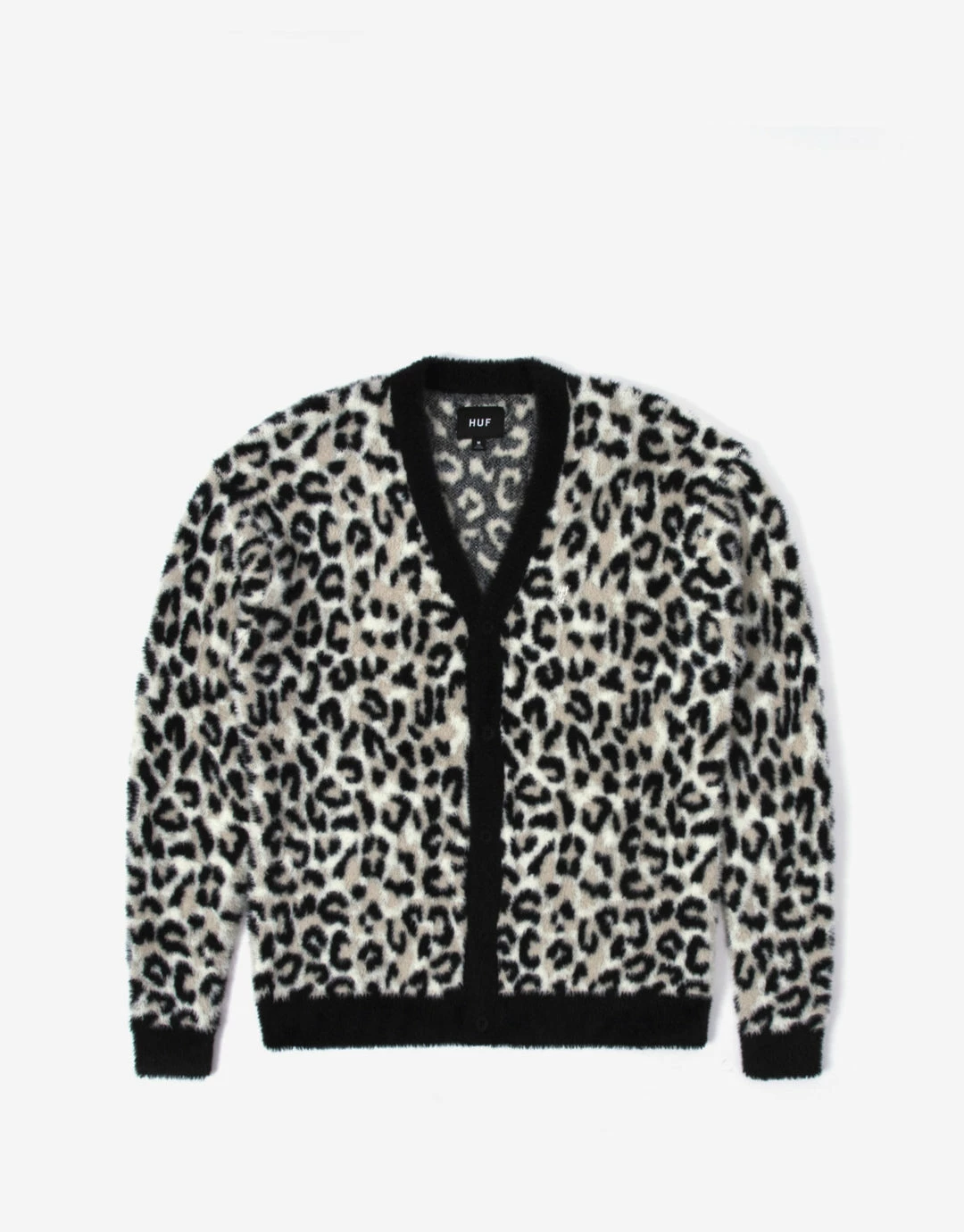 Made of soft faux mohair, the grunge-inspired Snow Leopard Cardigan features a steezy all-over leopard pattern in jacquard with solid-colour rib-knit trim. Cut with a buttoned front for easy layering, the cardigan is finished with a HUF ‘1984’ logo embroidered at the left chest.