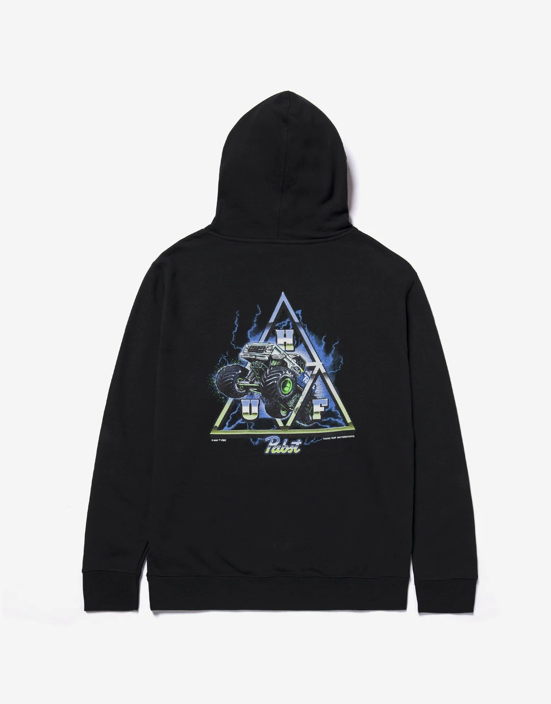 HUF link up once again with Pabst Blue Ribbon to perfectly merge the worlds of skateboarding and beer, which, let’s face it, go hand in hand. The HUF x PBR Pabst TT Hoody reworks the brands Triple Triangle logo into a retro style monster truck graphic. With details on the chest and back.