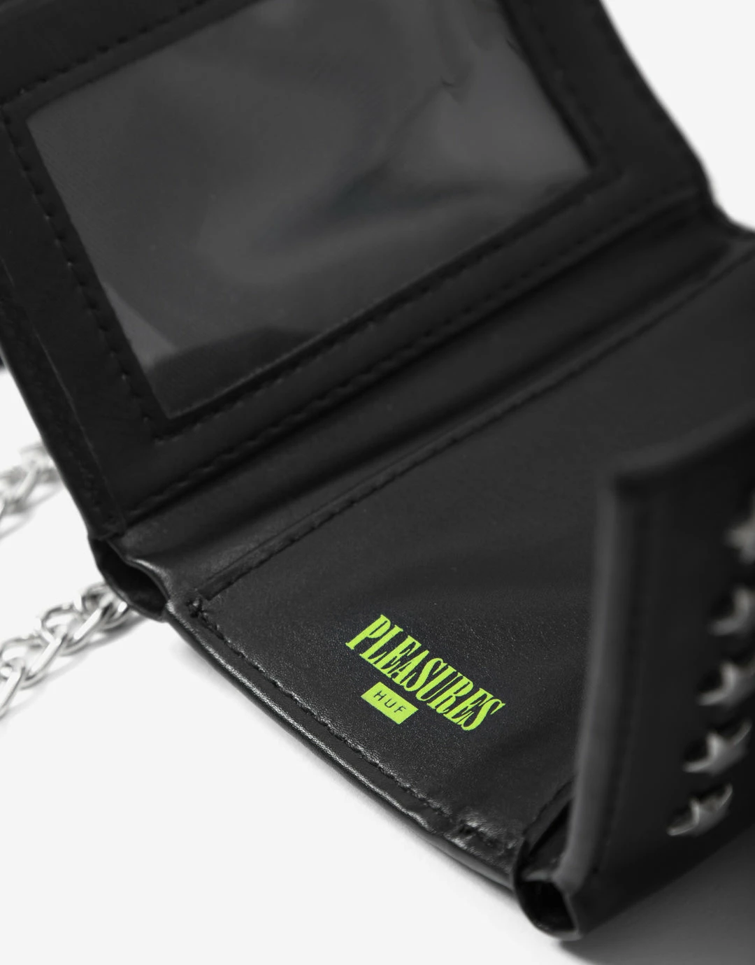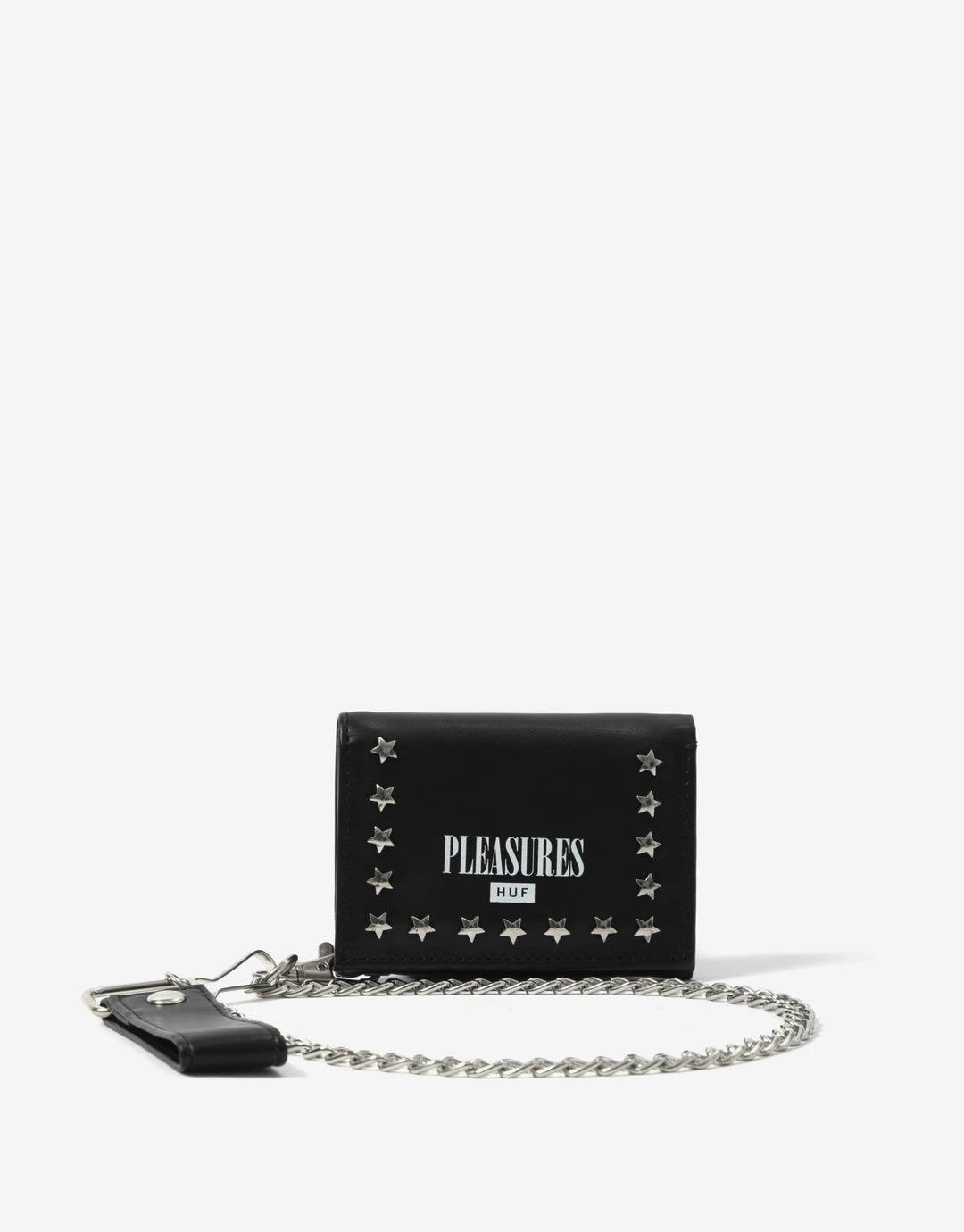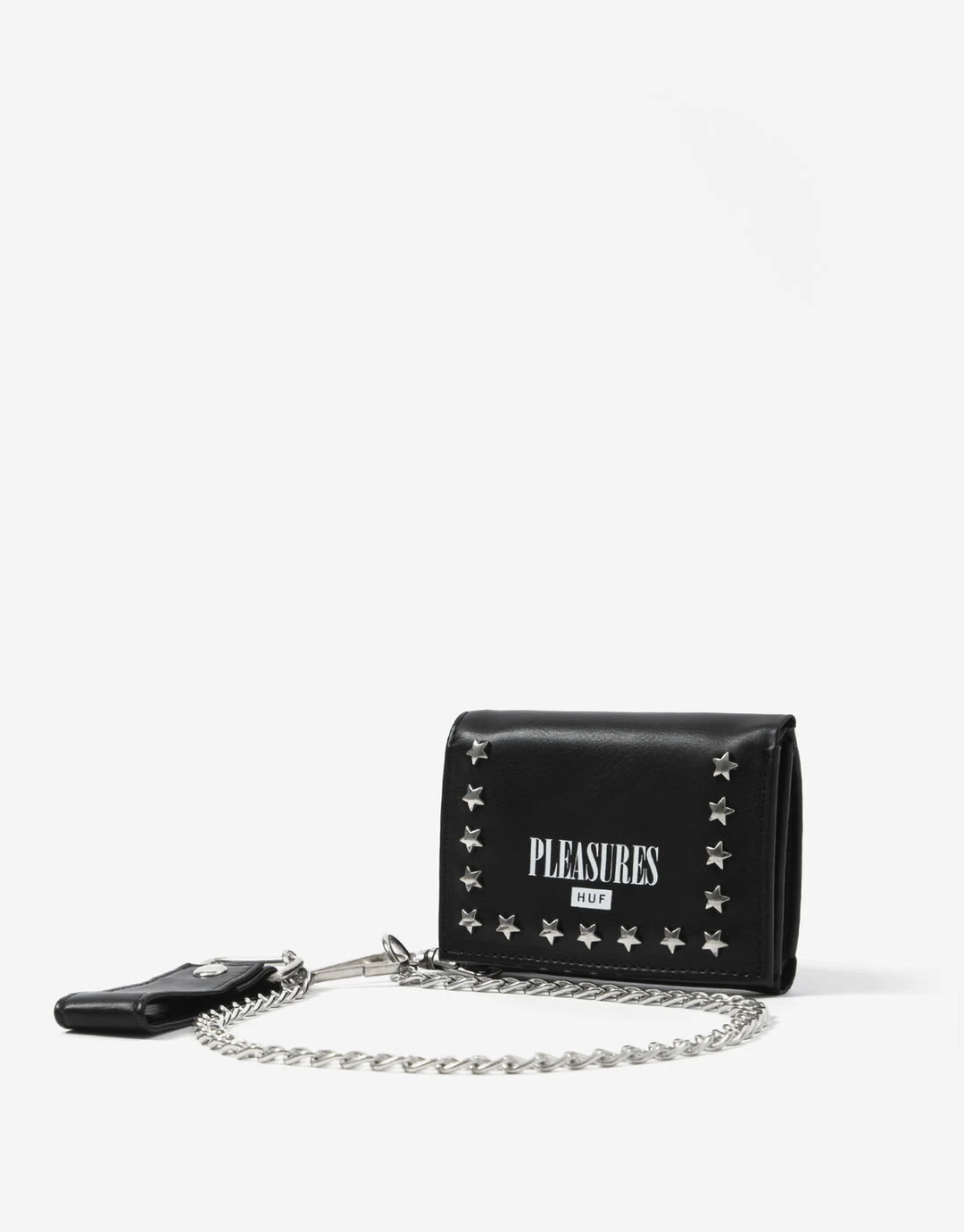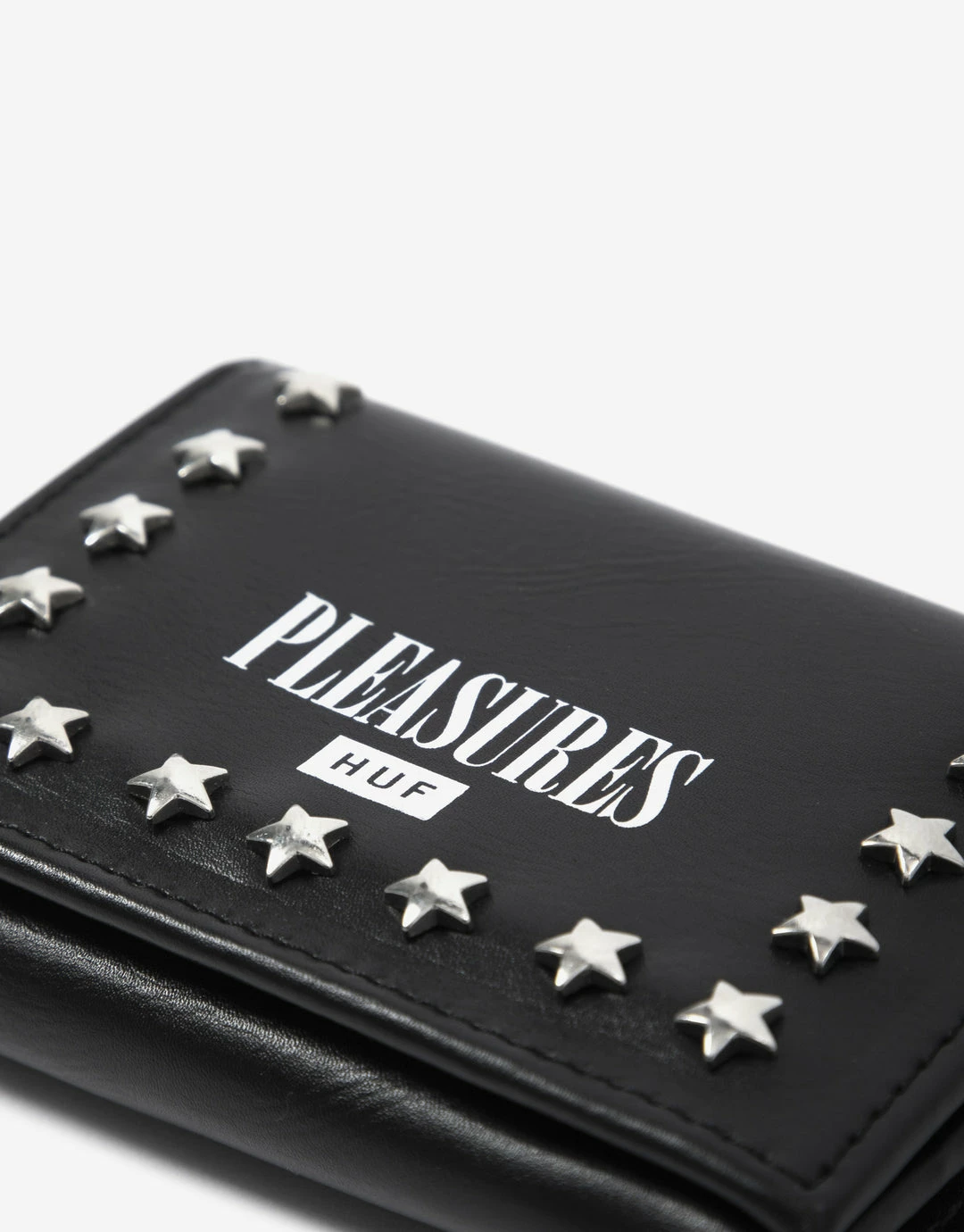 Skate scene favourites, HUF, link up with LA’s very own Pleasures on a capsule collection that marries perfectly the inimitable styles of the two esteemed brands. The HUF x Pleasures Armstrong Wallet channels pure 00’s flavour. With a wallet chain, and studded stars, it comes in PU leather with a screen printed logo.