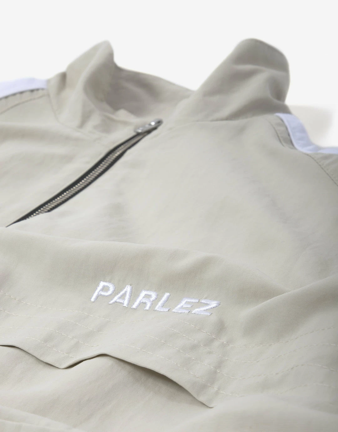 Parlez channel old school sportswear vibes with the Chatham Track Top. In a lightweight, 100% recycled Nylon, it features a full zip with mock neck, toggles in the hem, ribbed cuffs and a large patch pocket. Finished with embroidered Parlez branding at the chest and contrasting arm panels.Â