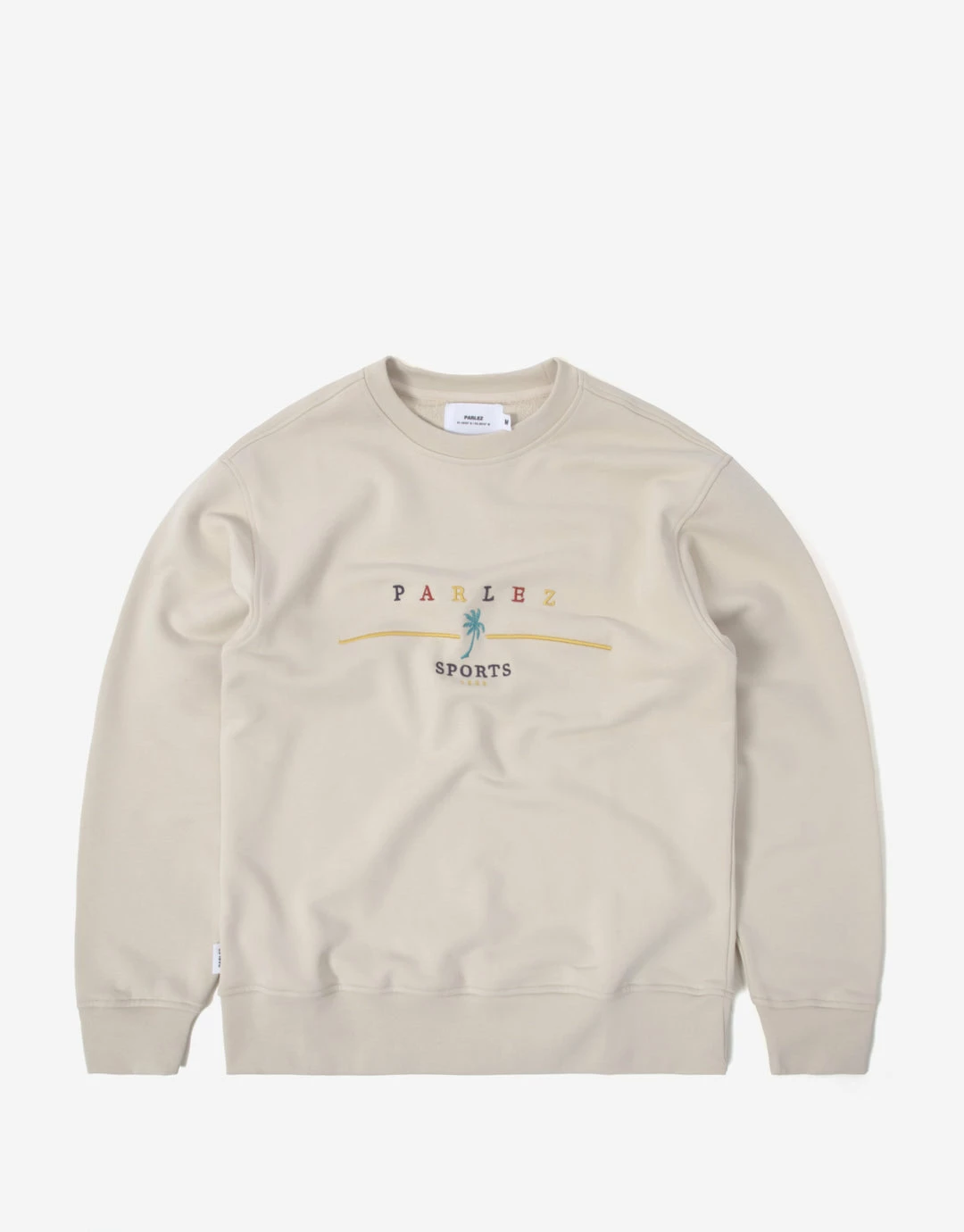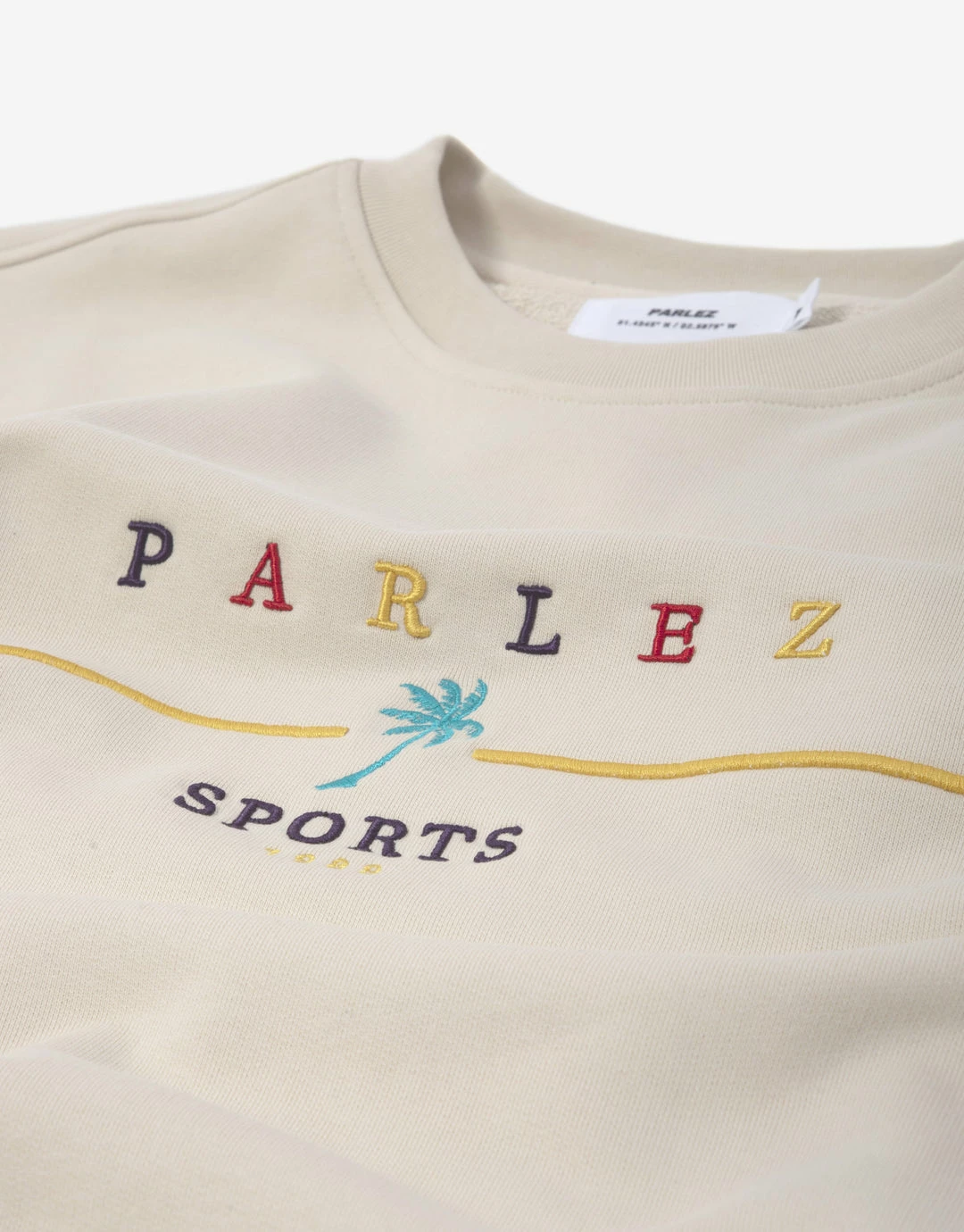 The Parlez Belair Crewneck features embroidered branding at the chest, set against an organic and recycled cotton body. With a multi-coloured design, this piece echoes vacation t shirt graphics, with plenty of Summer flavour. Finished with ribbed cuffs and hem in 380gsm cotton.