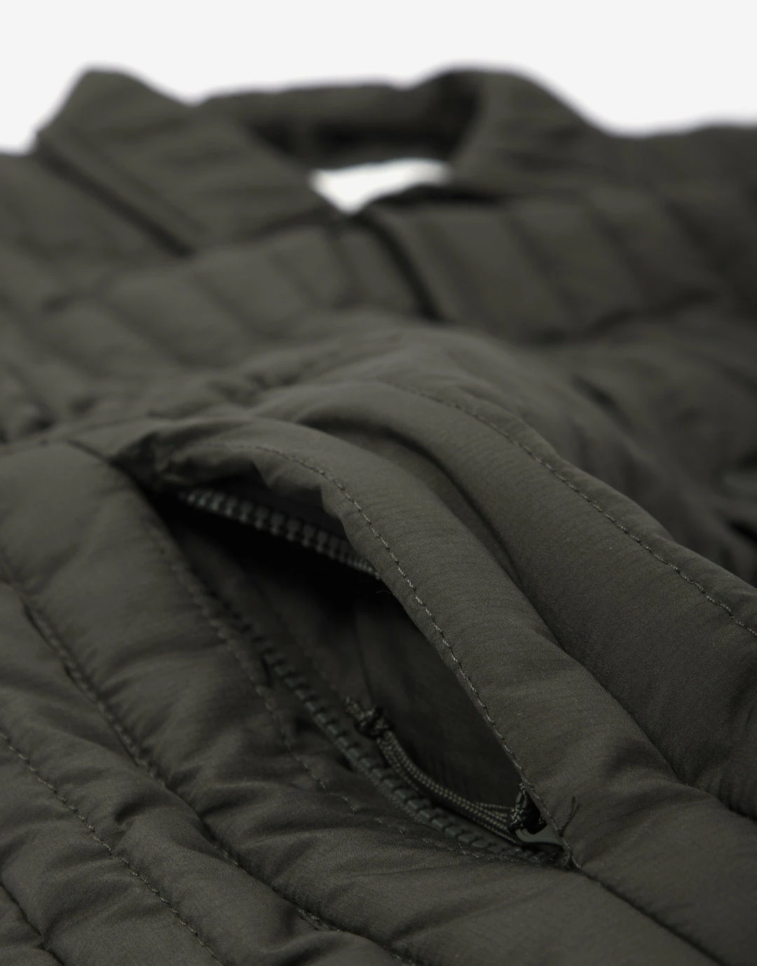 Liner Shirt Jacket features concealed front pockets, internal zip pocket and side slits with longer back hem. The look is contemporary, balancing its clean silhouette and concealed details with slim vertical quilting.
