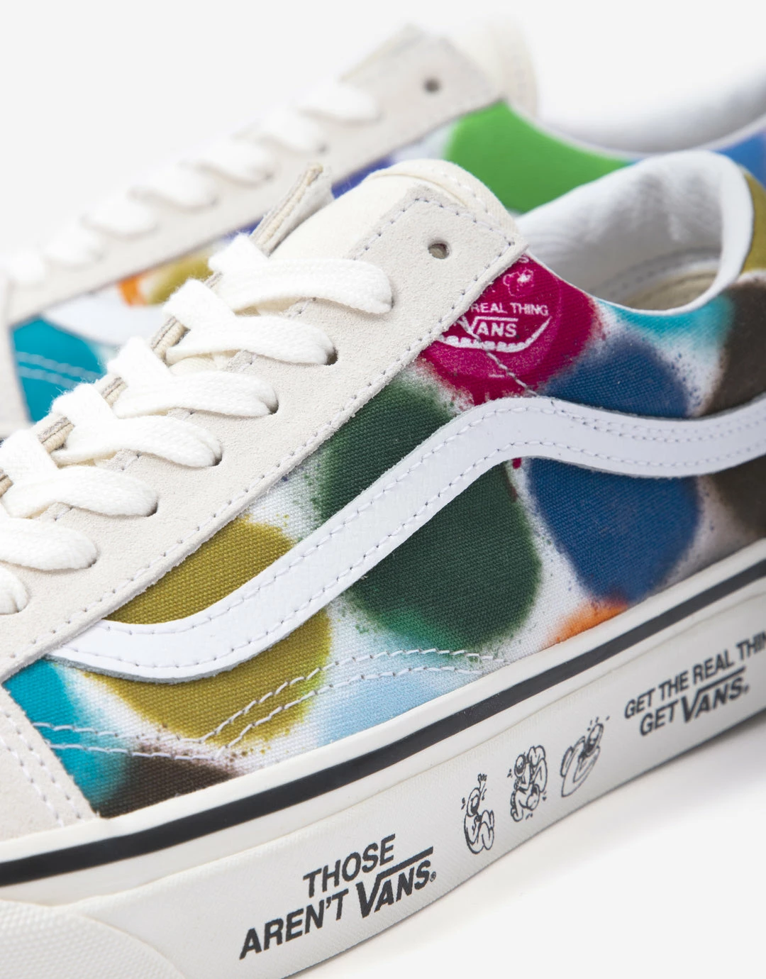 The Vans ‘Anaheim Factory’ Pack has design elements that date back to the 60s and 70s. Original Vans had style numbers that signified the original mould numbers. The Vans Old Skool was style 36. The Vans Old Skool ‘Anaheim Factory’ features some newer technology including modernised comfort with upgraded UltraCush sockliners. The Anaheim Factory Old Skool 36 DX also includes throwback details, higher glossed foxing tape, cotton laces, original drill lining weight, and suede and canvas uppers to complete the look. This pair feature playful spray paint dots across the uppers and small graphics to the outsole.